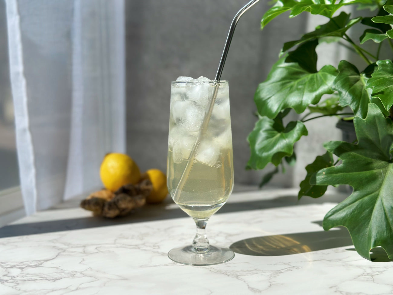 Pour 3 tbsp over a glass filled with ice and top with sparkling water. Feel free to garnish with ginger and lemon slices if you want some extra pizzaz!