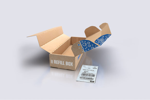 Place 2 empty canisters in provided CO2 Refill Box and attach our pre-paid shipping label. Reminder, we always refill 2 CO2 canisters at a time. Then simply mail the box to us via USPS.
